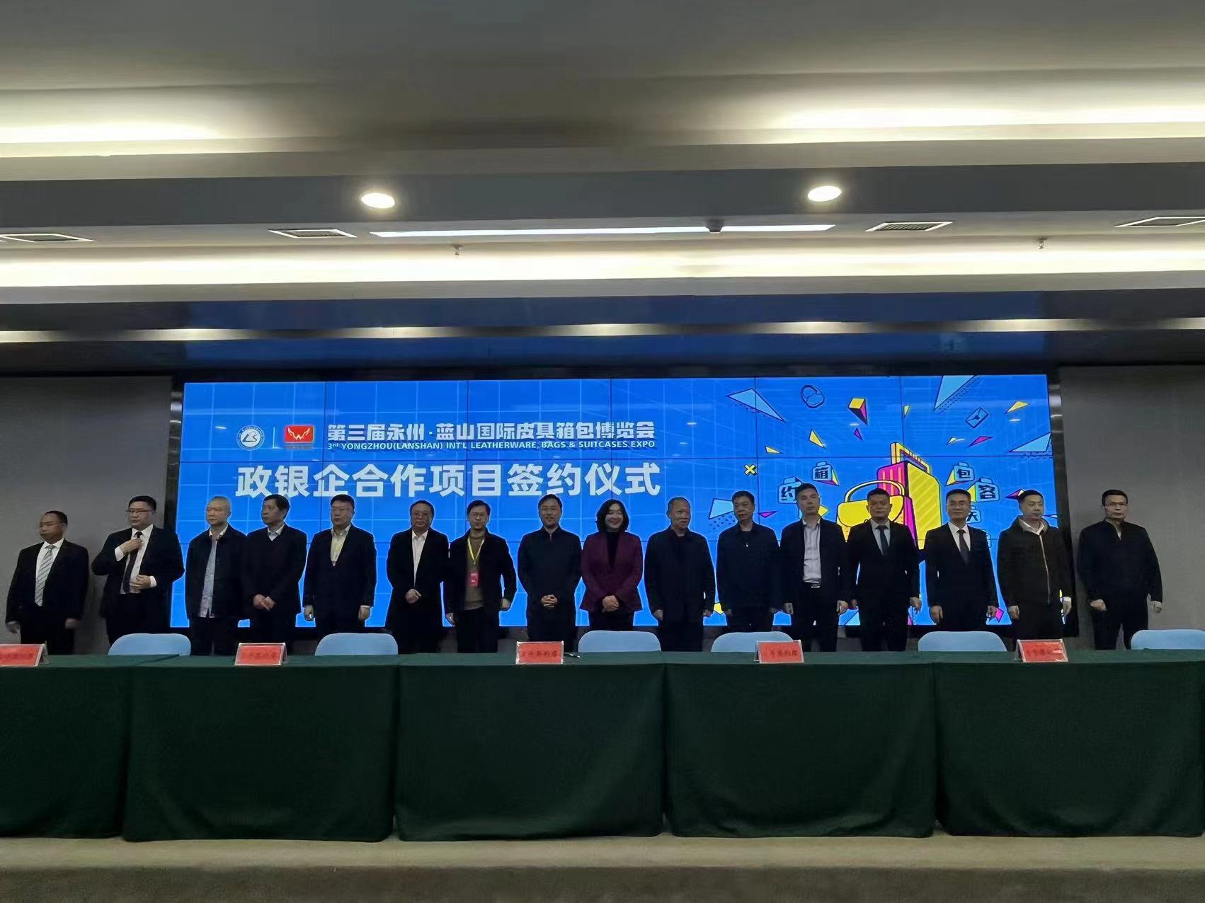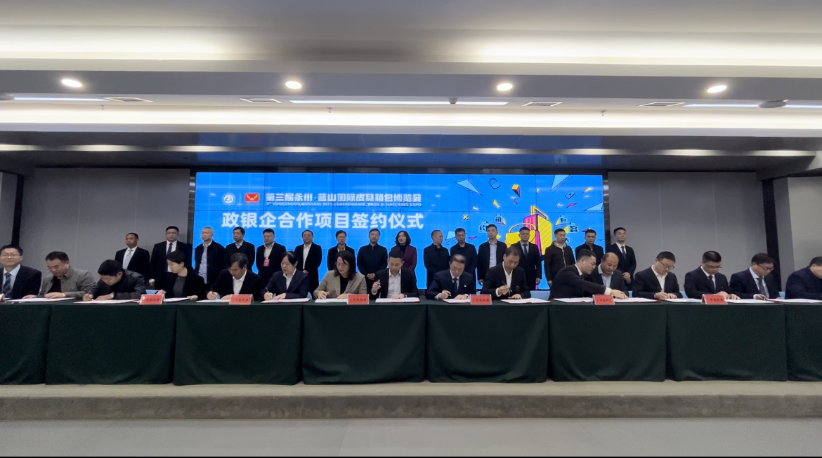 3月24日上午,第三屆永州·藍(lán)山國(guó)際皮具箱包博覽會(huì)開(kāi)幕后,藍(lán)山縣舉行政銀企合作項(xiàng)目簽約儀式。永州市政府副秘書(shū)長(zhǎng)肖瀟、永州市人民銀行中心支行行長(zhǎng)王一凡、永州市銀保監(jiān)分局二級(jí)調(diào)研員李樹(shù)屏、永州市優(yōu)化辦主任文貽榮、永州市各銀行機(jī)構(gòu)主要負(fù)責(zé)人以及藍(lán)山縣委副書(shū)記、縣長(zhǎng)鄧群,縣委常委、常務(wù)副縣長(zhǎng)張國(guó)材,副縣長(zhǎng)劉建軍等領(lǐng)導(dǎo)參加了儀式。