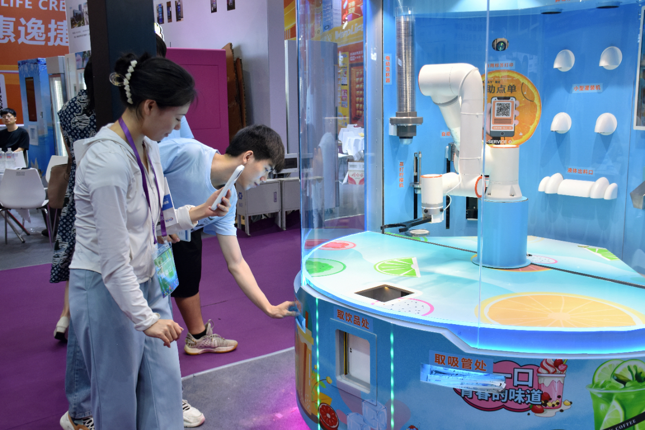 現場展示了自動制作咖啡、奶茶、爆米花、棉花糖、冰激凌、煲仔飯等餐飲產品的無人零售機器。
